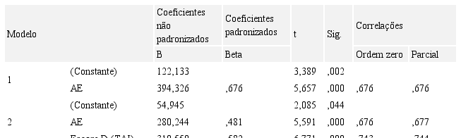 O modelo composto apenas pela variável AE na predição do comportamento de consumo mostrou-se adequado (R2 = 0,457) para F (1,38) = 32,002; p 0,01. O valor de β para a AE foi de 0,676; t (39) = 5,657; p = 0,000, conferindo ao modelo boa capacidade preditiva da variável dependente. Porém, os resultados apontaram o modelo de regressão composto pelo escore D e AE na predição dos valores gastos como mais adequado (R2 = 0,758) que o anterior para F (2,37) = 57,811; p 0,01. O valor de β para a AE foi 0,481; t (39) = 5,591; p = 0,000, enquanto para o escore D, o β foi 0,582; t (39) = 6,771; p = 0,000. Estes resultados apontam maior capacidade da Atitude Implícita para explicar a variável dependente (comportamento do consumidor) confirmando H2, não obstante a Atitude Explícita também teve sua contribuição validada na predição.