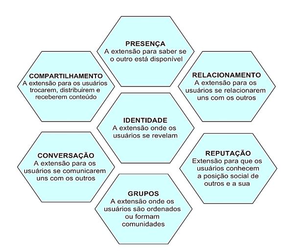 Ao enxergar as mídias sociais como plataformas interativas facilitadoras de compartilhamento e cocriação de conteúdo entre as partes interessadas (Malita, 2011), Kietzmann, Hermkens, McCarthy, & Silvestre. (2011) também estabelece critérios que a mídia social carece atender. O modelo Honeycomb, criado pelos autores, aborda sete aspectos funcionais (identidade, conversação, compartilhamento, presença, relacionamento, reputação e grupos) que são resumidos e apresentados na figura 1.