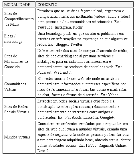 Diante da possibilidade de haver uma vasta gama de tecnologias e ferramentas que agregam as características citadas por Recuero (2009) e/ou os aspectos funcionais identificados por Kietzmann et al. (2011), permitindo que o objetivo de interação seja alcançado, Ngai et al (2015) apresentam seis modalidades de mídia social que fornecem aos indivíduos meios de relacionamento e compartilhamento de informações com os amigos e público em geral. Tais modalidades são classificadas e exemplificadas no quadro 1.