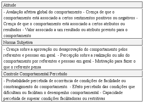 Contextualizando os construtos supracitados e suas relações na perspectiva desta pesquisa, ou seja, na mensuração do uso de mídias sociais por usuários de Internet, pode-se então afirmar que se o usuário de Internet possui uma atitude positiva com relação ao uso de mídias sociais, há maior probabilidade de intenção comportamental. Da mesma forma, se o uso de mídias sociais é visto como uma conduta comum e justa pelos demais, o indivíduo tem maior propensão ao comportamento, mas se for considerada imprópria pelos outros, o indivíduo evitará o comportamento. E, por fim, se o indivíduo acredita ter controle para utilizar uma mídia social, o mesmo tende a ser mais favorável a intenção de adoção e ao comportamento de adoção em si.