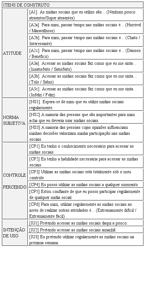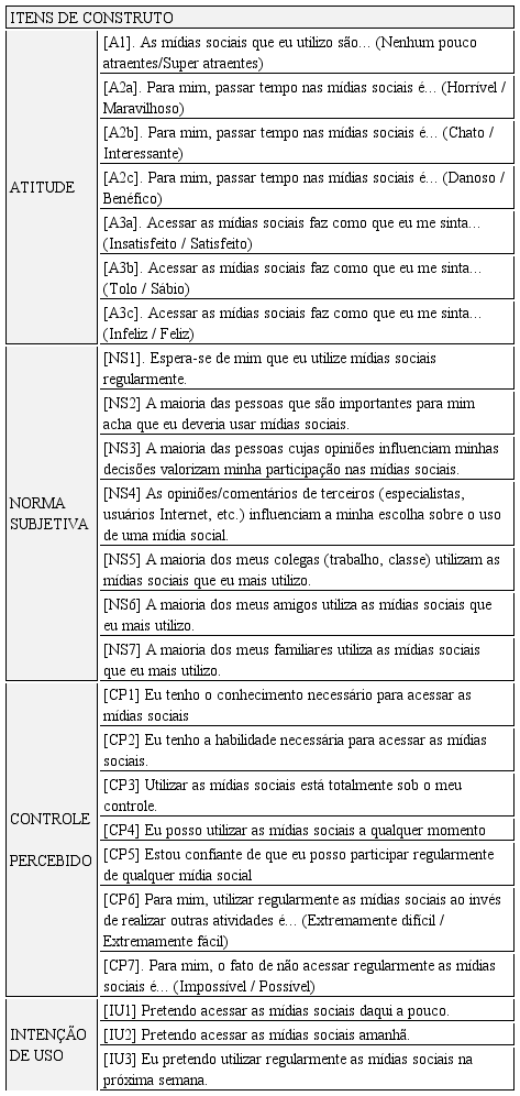Contextualizando as propostas de Ajzen (2006, 2017) para a elaboração de um instrumento de coleta de dados abarcado pela TPB, uma escala multidimensional para o uso de mídias sociais foi construída. Em tal processo de elaboração, foi feita a tradução reversa do exemplo de questionário indicado por Ajzen (2017), de modo que os itens de construto propostos foram adaptados para o contexto de investigação das mídias sociais. Além disso, as considerações de Ajzen (2006) para a construção de escalas baseadas na TPB também foram levadas em consideração no processo de tradução e adaptação dos itens de construto. Posteriormente, a escala construída foi submetida a validação de face por meio da verificação dos especialistas quanto a linguagem coerente dos itens, redundância das sentenças, troca e/ou acréscimo de palavras, visando uma melhor compreensão do instrumento de coleta. Assim, mediante as sugestões fornecidas pelos especialistas que avaliaram a escala proposta, as modificações feitas resultaram no instrumento final apresentado nos quadros 3 e 4 a seguir.