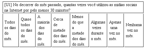 Diante das correções propostas no contato com os especialistas, o instrumento de coleta de dados final foi segmentado em três partes, sendo a primeira seção composta por itens relacionados aos tipos de mídias sociais propostas por Ngai et al (2015) e a frequência do comportamento, a segunda seção abordando os itens de construto apresentados no Quadro 2, mensurados por escala Likert de 1(discordo totalmente) a 7 (concordo totalmente), e a terceira seção trazendo as indagações referentes ao perfil amostral, baseadas nos critérios propostos pela Associação Brasileira de Empresas de Pesquisa [ABEP] (2016).