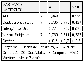 Outras análises que podem ser feitas perante os resultados apresentados referem-se as altas cargas de confiabilidade composta (0,848) e VME (0,676) da Intenção de Uso, cuja quantidade de itens na escala foi a menor (três) desde o início, mas que alcançou resultados consideráveis. Ressalta-se também que há resultados significativos do alfa de Cronbach (0,848) e dos escores de correlação de Pearson da variável Atitude, cuja mensuração contou com mais itens (sete), apontando que a qualidade dos itens foi percebida pelos respondentes, e mais influente do que a quantidade, para a concepção das variáveis.