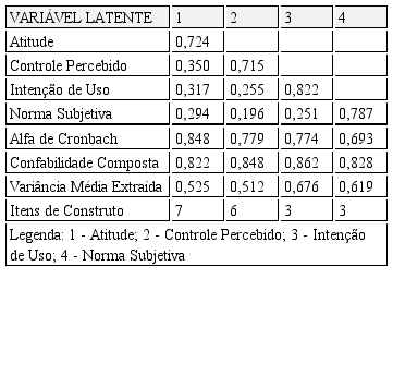 O refinamento dos itens, nesta análise, ocorre então por meio dos resultados referentes a validade convergente. Verifica-se na tabela 1 que as variáveis Controle Percebido e Norma Subjetiva não obtiveram carga acima de 0,5 para a variância média extraída, o que permite identificar que as variáveis não atingem 50% ou mais da variância que deve ser proporcionada pelos itens.
