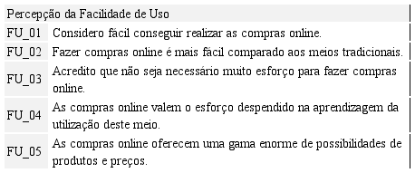 Segundo Davis (1989), a facilidade exerce uma posição decisiva durante a utilização de um sistema tecnológico ou virtual. Para Cruz (2017, p. 52), “a facilidade de utilização percebida representa os atributos do sistema em função da simplicidade de seu manuseio, quanto mais fácil for o sistema maior será a aceitação deste pelo usuário”. As variáveis foram as que resultaram dos ajustes feitos por Cruz (2017). O quadro 1 mostra as cinco variáveis do constructo Percepção da Facilidade de Uso.