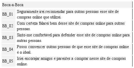 Palavras-chave: Relacionamento, Compras Online, Facilidade de Uso, Hospitalidade Virtual, Boca a Boca.
