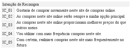 Este constructo foi incorporado a partir de Cruz (2017, p. 58), que o testou com sucesso em um contexto de reservas em meios de hospedagem: “usuários rejeitarão os sistemas cuja utilidade/percepção da facilidade de uso não for aprovada e, no caso contrário sua intenção de recompra será positiva”. Conforme o modelo proposto para este estudo, a Intenção de Recompra pode ser considerada um consequente dos constructos apresentados anteriormente. As variáveis foram adaptadas para esta pesquisa. O quadro 4 apresenta as cinco variáveis do constructo Intenção de Recompra.