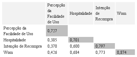 Do mesmo modo, a validade discriminante das variáveis latentes foi comprovada, quando se verificou que as raízes quadradas de cada variável eram superiores à correlação entre elas e, as demais variáveis latentes dos modelos, como demonstrado na tabela 1.