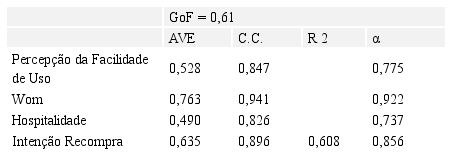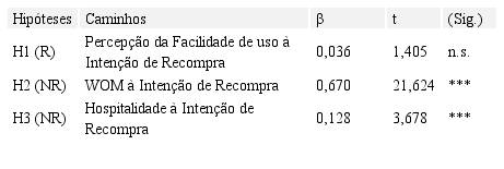 Porém, destaca-se que os coeficientes de caminho indicam que a Percepção da Facilidade de uso não possui uma relação positiva e significante com a Intenção de Recompra, o que faz com que a hipótese H2 seja rejeitada. Com relação a H3, esta também pode ser aceita, pois os coeficientes de caminho do modelo estrutural indicam que a Boca a boca (WOM) possui uma relação positiva e significante com a Intenção de Recompra (β= 0,670, t= 21,624, p 0,001).