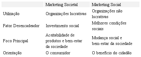 Marketing Societal também já foi erroneamente chamado de Marketing Social. O Marketing Societal, também conhecido como Marketing Verde, é definido como aquele indivíduo que busca para consumo apenas produtos que causem menor – ou nenhum – prejuízo ao meio ambiente e sociedade. No caso, são àqueles que buscam conscientemente produzir, mediante comportamento de consumo, um efeito nulo ou favorável sobre o meio ambiente e à sociedade como um todo. Maignan e Ferrel (2004) salientam que o uso do Marketing Societal ganha força inicialmente no setor de bens de consumo, mas avançou para o setor de serviços. A diferença do Marketing Societal do Social está no fato do primeiro ser uma extensão das práticas de Marketing Tradicional; e o segundo ser uma aplicação de Marketing. O quadro 2 ilustra as diferenciações entre Marketing Social e Societal.