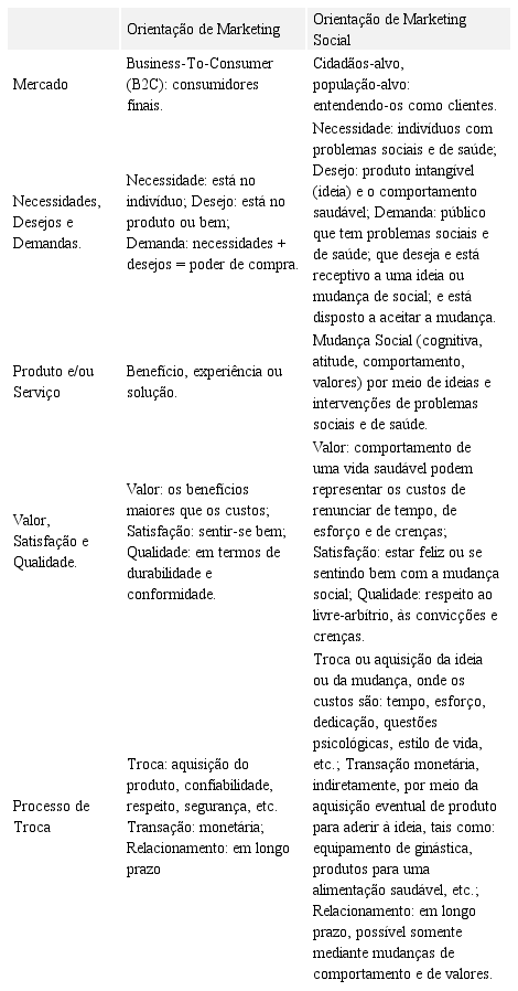 Se o Marketing Social é a aplicação de estratégias e práticas do Marketing Tradicional para o contexto social, então, quais as reais diferenças entre eles? O quadro 3 constrói uma analogia ente o Marketing Tradicional e Social. Em Smith e Strand (2009) é possível observar o estabelecimento de uma visão orientada ao Marketing é baseada em cinco princípios fundamentais: necessidades dos clientes; benefícios ao cliente; proposta de valor; Marketing como filosofia; e compreender que os clientes são diferentes entre si. Kotler e Lee (2008) procuram associar essa orientação à perspectiva do Marketing Social e promovem os seguintes elementos como determinantes: mudança de comportamento é o objetivo; cliente é o foco da mudança; e a criação de trocas atraentes para incentivar o comportamento a custos mínimos. No caso a orientação ao Marketing Social poderá ser necessária quando: novas informações ou determinadas práticas sociais precisam ser disseminadas; se tem em redução do consumo de produtos ou comportamentos perigosos à saúde; e é oportuno ativar uma ideia com a intenção para a ação do indivíduo.