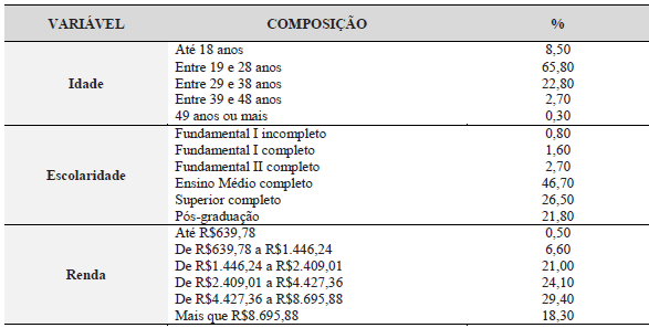 A maioria dos respondentes possui idade entre 19 e 28 anos, em que 25,80% dos respondentes possuem mais que 29 anos. A maioria dos respondentes tem pelo menos Ensino Médio completo, representando aproximadamente 95% da amostra. Sobre a renda, aproximadamente 71,80% da amostra está na faixa de renda que é considerada pelo menos Classe B (ABEP, 2015).