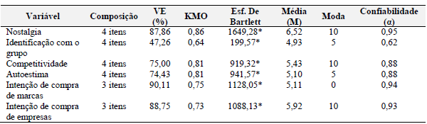 Em seguida, para analisar as respostas do uso do jogo e a intenção de compra, inicialmente foi realizada uma análise fatorial exploratória para verificar a estrutura dos dados. Os resultados encontram-se na Tabela 3. Com os ajustes, todas as medidas de adequação da amostra, variância total explicada, confiabilidade e significância dos testes de esfericidade de Bartlett aconteceram de acordo com os padrões aceitáveis (Field, 2013; Hair et al., 2009), exceto a confiabilidade da escala de identificação com o grupo, que ficou um pouco abaixo do valor aceitável (0,70) (Field, 2013).