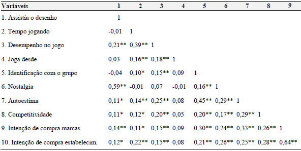 Na Tabela 4, podemos perceber indícios de algumas relações, como correlações positivas entre todas variáveis, exceto desde quando joga, com as variáveis de intenção de compra de marcas e de estabelecimentos. Destacamos a correlação entre assistir o desenho quando criança e a nostalgia provocada pelo uso do jogo (r=0,59; p0,01) e a correlação entre o tempo jogando e o desempenho no jogo (r=0,39; p0,01). Esses resultados nos fornecem alguns indícios das relações entre as variáveis, especialmente para a intenção de compras.