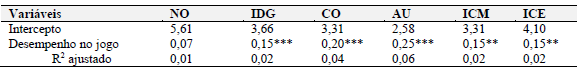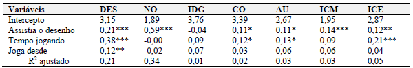 As três variáveis independentes influenciaram positivamente e de forma significativa a percepção de desempenho no jogo (assistia o desenho: β = 0,21; p0,001; tempo jogando: β = 0,38; p0,001; desde quando joga: β = 0,12; p0,01). Isso significa que quanto maior a proximidade com o desenho e quanto mais tempo o jogador passa jogando, maior a sua percepção de desempenho no jogo. Como dito anteriormente, isso pode acontecer pelo sistema de acumulação de bens e recompensas que o jogo fornece, motivando o jogador e tornando-o mais otimista sobre seus resultados (Granic et al., 2014).