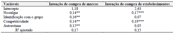 Por fim, a intenção de compra de marca foi impactada por assistir o desenho (β = 014; p0,001) e a intenção de compra no estabelecimento foi impactada por assistir o desenho (β = 0,12; p0,01) e pelo tempo jogando (β = 0,21; p0,001). Esses resultados apresentam que a intenção de compra é influenciada pela relação com o desenho, antes mesmo do jogo, e que quanto mais tempo jogando, maior a intenção de compra. Ho e Wu (2012) argumentam que os elementos que influenciam a intenção de compra podem derivar da sua utilidade, dos valores sociais e da satisfação com o jogo. Como há, nesse contexto, uma relação nostálgica dos indivíduos com o jogo, bem como uma identificação com o grupo de jogadores, isso pode suportar a decisão de compra.