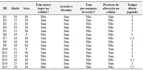 Foram entrevistados 15 jogadores de Pokémon GO. As entrevistas tiveram duração média de 11 minutos. A Tabela 1 apresenta um resumo de informações sobre os participantes da pesquisa. A idade média é de aproximadamente 22 anos. Além disso, a maioria dos entrevistados (13) é do sexo masculino. Sobre o tempo jogando, os entrevistados despendem entre 1,5 e 4 horas por dia.