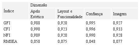 Em um primeiro teste, com o framework construído a partir das análises fatoriais confirmatórias, obteve-se uma carga muito fraca (0,051) entre a dimensão apelo estético e a dimensão confiança, com p=0,408 (ideal p0,05). Foi realizado, então, novo teste apenas com a dimensão layout e funcionalidade antecedendo a confiança e excluídas as variáveis com carga inferior a 0,5, chegando-se ao modelo final, apresentado na Figura 3. Os índices de ajustamento global para o modelo ficaram em 0,055 para o RMSEA e 0,918 para o CFI, ambos considerados ideais.