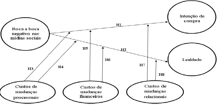 O modelo proposto examinará se a comunicação boca a boca negativa nas mídias sociais influencia negativamente a intenção de compra e a lealdade de outros consumidores e se os custos de mudança podem reduzir esses efeitos, conforme mostrado na Figura 1.