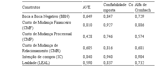 A Validade Convergente dos constructos foi confirmada por meio da aplicação do critério de Fornell e Larcker, segundo o qual a Variância Média Explicada (AVE) deve ser maior que 0,500, ou maior que 0,4, em estudos de caráter exploratórios (Nunnaly, 1994). Conforme pode ser observado na Tabela 1, somente a AVE de 0,428 estimada para o constructo Custo de Mudança Processual, está abaixo do valor de referência, sendo que os resultados apurados para os demais constructos atestam a Validade Convergente. A confiabilidade foi avaliada pelo Alfa de Cronbach e pela Confiabilidade Composta, seguindo indicações dos mesmos autores. Ambos devem atingir valores acima de 0,7, idealmente.