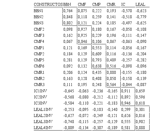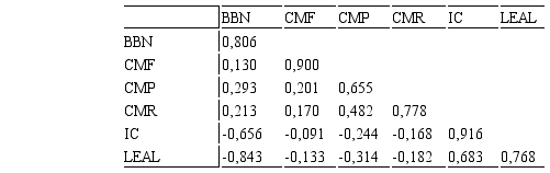 Nas Tabelas 2 e 3 são apresentados os resultados para o teste de Validade Discriminante O primeiro teste compara a raiz quadrada da AVE com o coeficiente de correlação entre os construtos e o segundo baseado nos Cross Loadings, que reforçam os resultados obtidos nos testes anteriores, tendo em vista que a carga dos indicadores nos respectivos constructos é maior que a sua carga nos demais constructos.