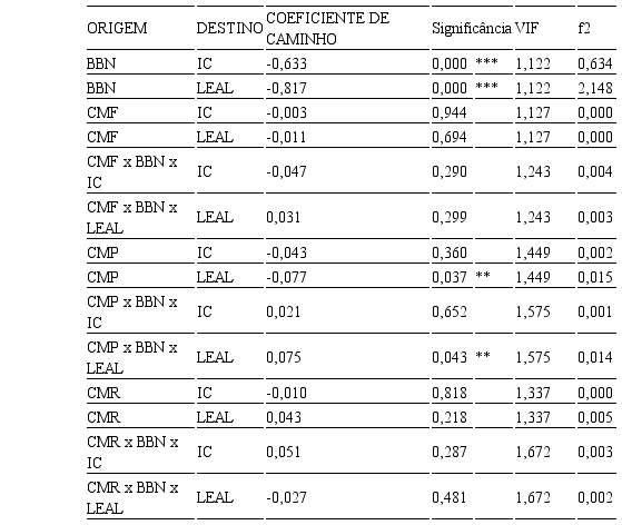 O ajuste do modelo também pode ser verificado por meio dos critérios de verificação da Validade Preditiva, com a utilização do indicador de Stone-Geisser (Q.). Os valores apurados para esse indicador são positivos, atestando a validade preditiva do modelo estrutural (Intenção de compra = 0,340 e Lealdade = 0,395). Quanto ao tamanho do efeito (f.) do constructo Boca a boca negativo (BBN) nos constructos Intenção de compra e Lealdade, os valores de 0,634 e 2,148, respectivamente, ficaram acima do limite de 0,350 para um efeito grande – Tabela 4.