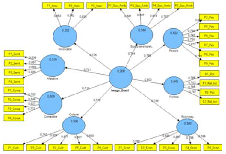 The profile of the sample and the data obtained by the survey were estimated, the second-order reflective model was estimated, which allows the use of a latent variable that can be measured by other latent variables, in which the indicators were the manifestations of each one. In this way, the image of Brazil was influenced by the affective component (feelings), the conative component (behavioral intentions) and the cognitive component (beliefs). The beliefs as an influence for the dimensions of culture, economy, politics, people, socio-environmental and innovation, according to the hypotheses stipulated by the research.