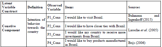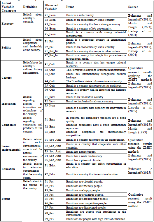 For the construction of the scales were used the literature of Buhmann and Ingenhoff (2015), Brijs, Bloemer and Kasper (2011), Sikonja, Brijs and Vanhoof (2009), Roth and Diamantopoulos (2009), and Laroche et al. (2005) on existing conceptual approaches on "country image”. In which the country image is composed of a cognitive component, an affective component and a conative component.
