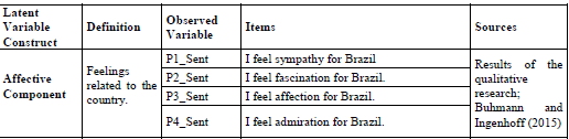 Giving sequence, the next component analyzed was affective, and based on the theoretical discussions presented the proposed scale for the affective component of the Brazilian image (Chart 2) includes four feelings, which were extracted from the qualitative studies carried out and from the suggested scale by Buhmann and Ingenhoff (2015). This scale was chosen because it has a high external validity; additionally, there are not many studies that examine feelings as part of a country's image.