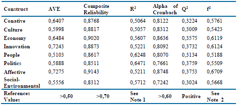 The analysis of table 1 clearly indicates that the model can be considered adjusted as a whole, soon after the elimination of variables that are not adherent to them, we obtained indicators that met the adjustment requirements of the PLS-SEM (modeling used).