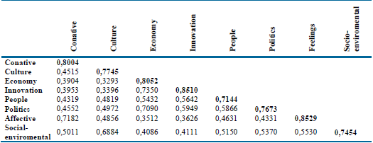 In addition to the quality of the fit model, the discriminant validity must be analyzed, since the constructs must relate, but be independent (Hair et al., 2014). Fornell and Larcker criteria are used for this, comparing the square roots of the AVE values for each construct with the Pearson correlations between the constructs (or latent variables). The square roots of the AVE should be larger than the correlation between the constructs shown in Table 2.