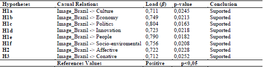Source: Data generated by the SmatPLS 2.0-M3After finding that the model had an adequate adjustment (figure 1), one can analyze the hypotheses created from the theory and that are presented in Table 3. In this model it is possible to observe that the image of Brazil is formed by the components of the image of a country, being the cognitive (beliefs), affective (feelings) and conative (behavioral intentions).
