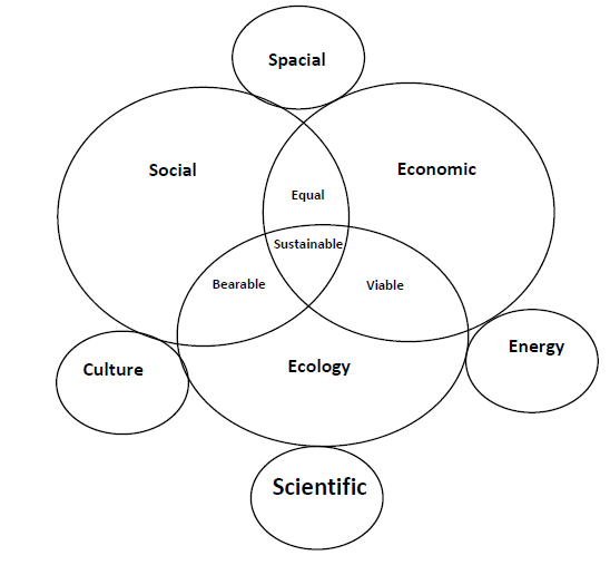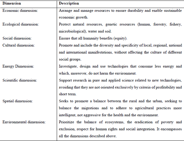 The Brundtland report refers to the preservation of the environment through "sustainable development", conceived as a multidimensional process with three dimensions that constitute it (Artaraz, 2002): the Economic Dimension, the Ecological Dimension and the SocialDimension. In this context, Sachs (2000) and some authors have associated the idea ofsustainability with ecological aspects, as can be seen in the works of Hoffman (2000), Jenningsand Zandbergen (1995) and Calvelo Ríos (2001), Which add more dimensions: the CulturalDimension, the Energy Dimension, the Scientific Dimension, the Space Dimension and theEnvironmental Dimension (see Table 1). Sustainable Development is much more than anecological concept, since it raises the fundamental challenge of combining a dynamic (energy)economy with a (cultural) society that offers opportunities for all, while improving theproductivity of resources (spatiality) and the growth of (scientific) degradation of theenvironment is cut off (Rossi, 2012), see Figure 1.