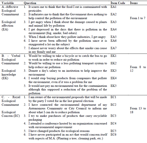 The behavior of the ecological consumer has been measured in different ways and through different variables that are related to each other, because of the multidisciplinary nature of the concepts focused from their analysis to the study of greater or lesser environmental responsibility (Stone, Barles and Montgomery, 1995), to a greater or lesser ecological awareness (Sánchez, Gil and Gracia, 1998). Such relationships can occur between attitude and general ecological behavior (Hines, Hungerford and Tomera, 1986/87, Kaiser, Ranney, Hartig and Bowler, 1999; Kaiser, et al., 1999), between attitudes towards the environment and (Maloney, et al., 1975; Schahn and Holzer, 1990) on the balance of nature and the possibility of an ecological catastrophe outside consumer behavior (Dunlap and Van Liere 1978, Kotchen and Reiling, 2000).