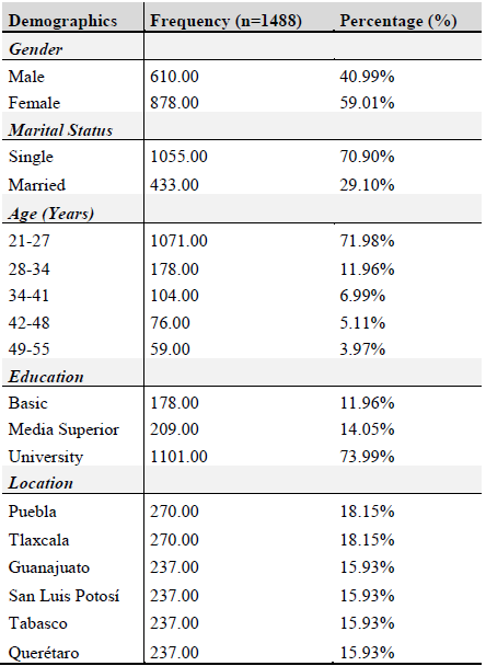 Overall, frequency analysis revealed that the majority of the respondents were female (59.01%), single (70.90%). Mostly the sample were composed of about 71.98% aged between 21 to 27 years old and in term of education level, majority of the respondents have entered university with 73.99%. Geographically, were six (6) states of Mexico, who integrated of simple: Puebla and Tlaxcala with 270 (18%) respondents each one, Guanajuato, San Luis Potosí, Tabasco and Querétaro with 237 (16%) respondents each one, see the Table 3.