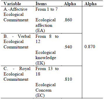 Using the SPSS software, these tests have been realised for each of the four measurement scales (see Table 4). The results confirm the reliability of the modified scales; the Chrombach’s alpha has the following values: A.-Affective Ecological Commitment, the Ecological affection (EA): 0.860; B. - Verbal Ecological Commitment, the Ecological knowledge (EK): 0.940 and C. - Royal Ecological Commitment, the Ecological Concern (EC): 0.810. Furthermore, in comparison with scales used in Straughan and Roberts’ (1999) study and Selvanathan, Selvanathan, Keller and Warrack (2004) stated that questions with Cronbach Alpha above 0.50 can be used and acceptable. Therefore, it can be concluded that all the items under studied were acceptable. Because, the adapted questionnaire has a higher reliability (Cronbach Alpha values ranged between 0.810 to 0.940), with 0.870 as general Chrombach’s alpha.