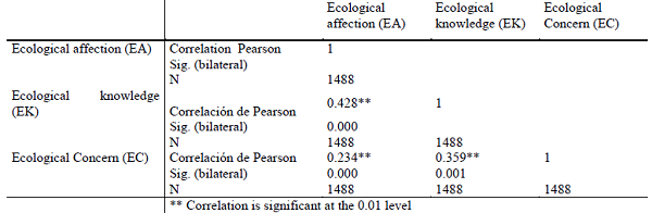 Likewise, the existence of a weak but statistically significant positive correlation 5 is detected between factor 3 (concern for environmental contamination) and the level of ecological knowledge of the individual (r = 0.12, p = 0.026).