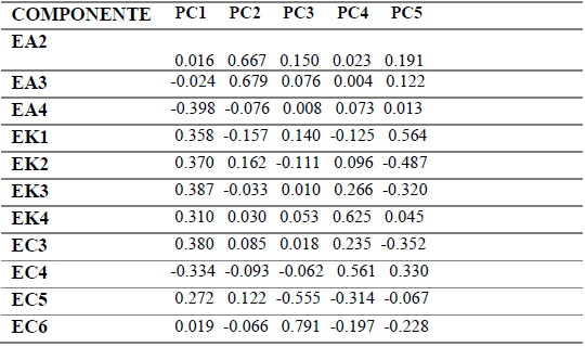 In a second analysis, it was decided to approach the information through factors that address the statistical technique of factor analysis, through which it is possible to obtain a general and broad view by reducing a large set of observable variables to hypothetical variables called factors; that is, this process allows us to represent a large number of variables in a space of small dimension called factorial space, which allows us to continue interpreting the relationships between them. When applying the technique of exploratory factor analysis (EFA), favorable indicators were observed, as shown in Table 6. To try to identify the underlying dimensions of the general ecological attitude, the main components were applied as extraction methods. First, according to the Bartlett sphericity test (218.563, p = 0.000) the hypothesis is accepted, so there are significant inter-correlations between the variables. Also with the Kaiser- Meyer-Olkin statistic presents an intermediate value (KMO = 0.798). According to this, a certain correlation structure is detected, so that a factor analysis can be performed. According to the criterion of own value greater than unity, five factors were found, with a explained variance percentage of 50.35%.