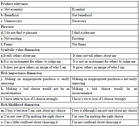 However, Kapferer and Laurent (1985) question the one-dimensional nature of the involvement measurement and suggest that no feature alone is able to account for the complexity of this construct. Based on this scale, Jain and Srinivasan (1990) developed their Involvement Measurement Scale, known as New Involvement Profile (NIP), which comprises fifteen semantic differential items (seven points each) distributed among five factors: relevance, pleasure, symbolic value, risk importance and risk likelihood. Each respondent should fill in one of the seven spaces by indicating whether the evaluated product is closer to one or another extreme point (Fonseca & Rossi, 1998).