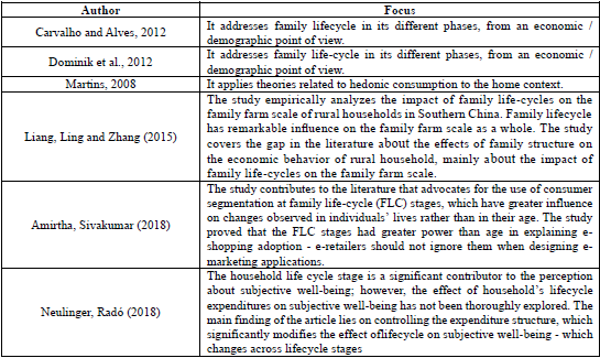 Accordingly, the aim of the current study was to understand the influence ofinvolvement with products focused on leisure and gastronomy - books, trips and wines - on the consumption practices of empty nest families belonging to classes A and B, in a large Brazilian state capital. Table 1 lists the the articles indexed in Scielo, Google Academic and Ebsco databases about the relationship between consumption and family lifecyle.