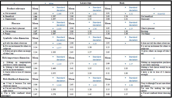 A table summarizing the main results in the current study took into consideration the five factors determining the involvement of empty nest couples with books, wine brands and trips, namely: relevance, pleasure, symbolic value, risk importance and risk likelihood.