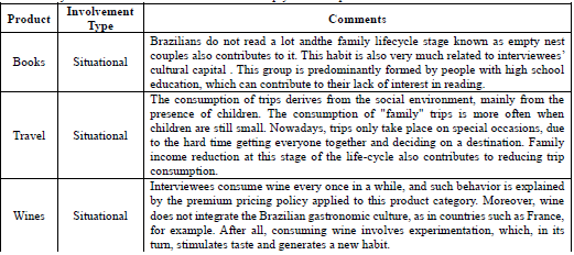 The aims of the current study were to investigate the involvement of empty nest couples living in a large Brazilian metropolis with products focused on culture, leisure/entertainment and gastronomy (books, trips and wines), as well as to investigate the impacts of such involvement on these couples’ consumption practices. These couples did not show high involvement with the investigated products, because they did not perceive them as relevant when the determinants of this phenomenon - the importance of the object or situation - were taken into consideration. The following table summarizes the herein recorded findings to make the understanding of these results easier - the findings were followed by the respective comments.