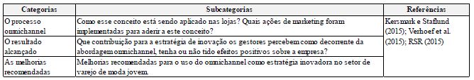 Os dados primários foram coletados por meio de observação e entrevista em profundidade (Vergara, 2012). As entrevistas em profundidade foram aplicadas de forma pessoal e individualizada no ambiente da organização, gravadas e guiadas por um roteiro de entrevista. A pesquisa foi realizada com pessoas envolvidas no processo de implementação do omnichannel: gerente de marketing (Entrevistado # 1), gerente de loja (Entrevistado # 2) e gerente de compras (Entrevistado # 3). Também foram entrevistados dois clientes multicanais (Entrevistado # 4 e Entrevistado # 5). Os assuntos discutidos foram: o processo omnichannel na empresa, como esse conceito está sendo aplicado nas lojas, ações de marketing implementadas para aderir a esse conceito, contribuições da abordagem omnichannel, efeitos sobre a empresa e recomendações de melhorias para aplicação como estratégia de inovação em marketing. O roteiro de entrevista foi elaborado a partir do Kersmark e Staflund (2015), Verhoef et al. (2015) e da escala Autoavaliação da Maturidade Omni-Channel desenvolvida pela Retail Systems Research(RSR, 2015). A pesquisa de campo foi realizada em novembro de 2015 (membros da empresa) e em fevereiro de 2018 (clientes).