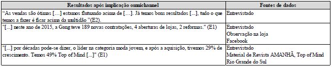 Mesmo com o omnichannel não completamente implementado, alguns resultados positivos de sua implementação podem ser vistos na empresa. A Gang não divulgou números exatos de receita ou dados sobre crescimento de vendas, mas os entrevistados (entrevistado # 1, entrevistado # 2 e entrevistado # 3) manifetaram-se muito satisfeitos com os resultados alcançados, indicando que a empresa cresceu acima da taxa de mercado, confirmando os achados de Simone e Sabbadin (2018) e Sopadjieva et al. (2017). Em 2015, apesar de ter sido considerado um ano ruim para a economia brasileira, a empresa teve 189 novas contratações, quatro inaugurações de lojas e duas reformas, conforme mencionado pelo entrevistado 1 e também reforçadas pelos entrevistados 2 e 3. Em 2016, a Gang estava com 49% no “Top of Mind” na categoria de Youth Fashion Store, o que representa um aumento de duas vezes no reconhecimento nos últimos dois anos.