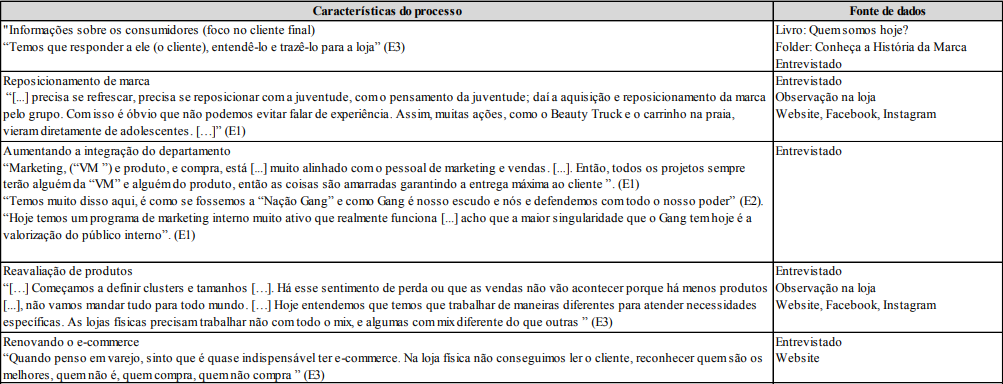 Outro aspecto ressaltado pelos entrevistados é a integração entre on-line . off-line, destacando que o cliente não percebe essa diferença. Identificou-se na empresa o compromisso de focar no cliente final, conforme recomendado por Melero et al. (2016). Todos os entrevistados mencionaram várias vezes a importância do cliente e ressaltaram que as ações da empresa levaram o consumidor em consideração. Seu objetivo é criar uma experiência que faça o cliente se sentir bem. Assim, a empresa trabalha para impressionar o cliente e para criar seguidores que lembrem a marca, além de atrair novos clientes. Esse compromisso exige o desenvolvimento de estratégias de marketing mais ousadas e focadas no cliente, alinhadas com Kersmark e Staflund (2015), e Payne et al. (2017). Segundo os entrevistados, Gang deve ser a expressão do comportamento juvenil e, mais do que uma marca de moda ou vendedora de produtos, tem que estar comprometida com as experiências e o comportamento dessa geração.