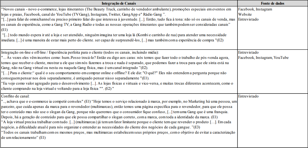 Para responder à integração de canais e criar a experiência de compra, as lojas físicas da empresa estão sendo reestruturadas (Simone, & Sabbadin, 2018). O redesenho do layout das lojas físicas foi feito com base em pesquisas comportamentais com clientes-alvo, na necessidade de inovação e, para a sobrevivência do formato tradicional (Parente, & Barki, 2014). As novas lojas são construídas com a participação de artistas de cada região (de tatuadores a grafiteiros). No início, o comércio eletrônico realmente criava um conflito entre os canais e alguns acreditavam que isso poderia canibalizar as vendas dos canais tradicionais. No entanto, após o processo de aquisição da empresa e o trabalho de marketing interno, eles começaram a entender que esses canais não compete entre sí, mas se complementam, como apontado por Aubrey e Judge (2012), Grewal et al. (2017) e Simone e Sabbadin (2018). O entrevistado # 2 argumenta que um canal auxilia o outro no acesso a clientes de diferentes cidades e estados, e permite contribuir para o desejo de visitar as lojas físicas. Ele citou como exemplo um cliente on-line da cidade de Cuiabá, Estado do Mato Grosso, que visitou a loja enquanto estava na cidade de Porto Alegre, no Estado do Rio Grande do Sul. A orientação estratégica da empresa é manter toda a gestão da marca no Departamento de Marketing, criando uma identidade de marca, uma visão clara da atuação em todos os canais, permitindo a comunicação específica e direcionada através de diferentes canais. A empresa acredita que precisa explorar cada canal de acordo com suas características particulares, logística e comportamento específico dos clientes, além da integração de canais que proporcionam uma experiência única aos clients, em relação à promoção e ao mix de produtos oferecidos, como mostrado no estudo de Brynjolfsson et al. (2013), Piotrowicz e Cuthbertson (2014) e Melero et al. (2016). A empresa também entende que isso deve estar explorando os benefícios de cada canal e superando suas deficiências, como recomendado por Zhang et al. (2010) e Mosquera et al. (2017). Os esforços de estruturação e processos de cada canal de vendas para atender aos jovens com a marca da empresa são claros onde quer que a Gang esteja. Os benefícios intrínsecos do canal on- line e da loja física são bem explorados de forma integrada. Além disso, o varejo on-line oferece a oportunidade de coletar informações sobre os clientes e o comportamento de compra, confirmando os achados do estudo de Zhang et al. (2010) e Mosquera et al. 2017. Embora um canal reforce o outro, e mesmo fazendo uso de diferentes canais e mídias de comunicação e mercado (Payne et al., 2017), a integração não é total, pois a empresa não gerencia a multimarcas. Os produtos são comprados de acordo com cada multimarca, e não importa o quanto a Gang trabalhe para direccionar produtos, o revendedor tem a palavra final sobre as escolhas e a empresa não pode controlar seu estoque de produtos. O desenvolvimento de produtos para este canal é baseado em compras anteriores e em características do ambiente, mas eles podem não ser muito assertivos e não podem fazer uma integração de todos os canais. É outro grupo da Gang, a BBR, que vende para os canais multimarcas. Os produtos comprados na loja virtual ou física não podem ser trocados por meio desse canal (multimarcas) e os produtos não têm o mesmo preço.