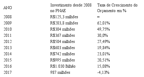 Verifica-se que, considerando o contexto da expansão e democratização do ensino, que é um dos objetivos do Pnae, houve algum tipo de ampliação de orçamento ao longo dos nove anos, com alguma exceção em 2016. De acordo com a tabela e com os dados da MEC, houve mais de 5 bilhões e meio de reais que foi investido em assistência estudantil desde 2008, no processo de efetivação do Pnaes, até 2017. É importante neste quesito de orçamento considerar o momento político, econômico e social que determina as opções políticas e tipo de políticas a seguir e investir (Nascimento, 2012; Moraes, 2011).