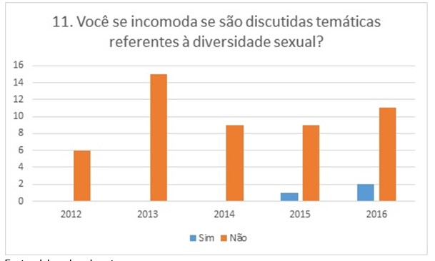 Por fim, há de se ressaltar que quase a totalidade dos alunos das cinco turmas, excetuando um aluno da turma T2015 e dois alunos da turma T2016, afirma não se incomodar se as temáticas de diversidade sexual são discutidas em sala de aula.