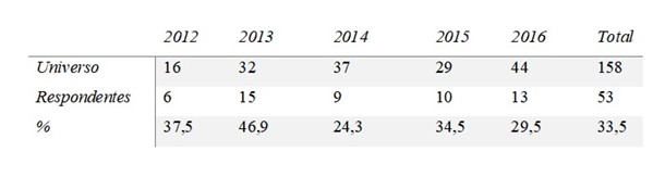 Tendo em vista que poucos alunos das turmas T2010 e T2011 não impactariam na amostragem, decidimos não contabilizar estas turmas e manter, para análise, apenas cinco turmas: T2012, T2013, T2014, T2015 e T2016, totalizando 158 alunos com 16, 32, 37, 29 e 44 alunos matriculados respectivamente, em cada turma. Deste universo de 158 alunos obtivemos 53 respondentes, 33,5% de sucesso, com 6, 15, 9, 10 e 13 respondentes para as turmas T2012, T2013, T2014, T2015 e T2016 respectivamente, conforme pode ser observado na tabela a seguir.