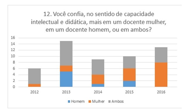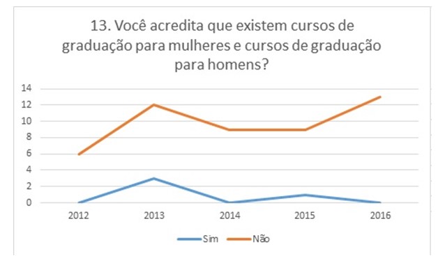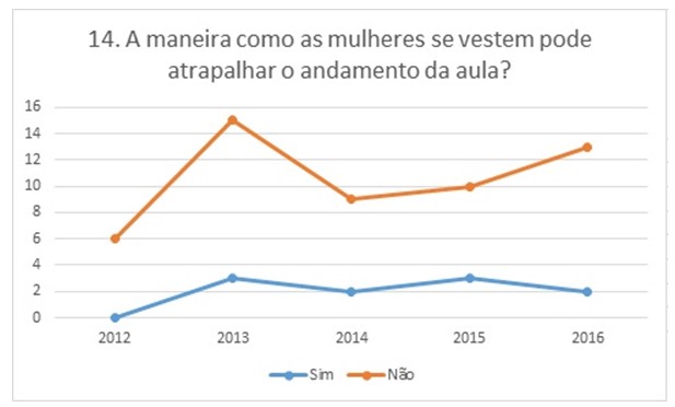 Ainda: quatro estudantes responderam que existem cursos de graduação adequados para homens e outros para mulheres e três destes estudantes as da turma T2013, relativamente antiga e que já teve contato com boa parte do conteúdo do curso. Também não há como desconsiderar que uma regularidade de dois a três estudantes por turma afirma que a maneira como as mulheres se vestem pode atrapalhar o andamento das aulas, a exceção foi a turma T2012 com zero de respondentes.
